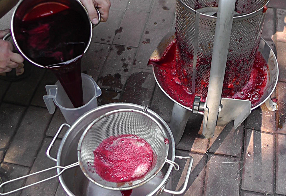 Brombeeren in der BeerenmühleFür kleinere Mengen benutze ich für Brombeeren weiterhin meine Beerenmühle. Da ist der Wirkungsgrad noch besser. Die Früchte durch ein Sieb zu streichen zum Entsaften, ist natürlich auch ok. Der nette Nebeneffekt vom Tieffrieren und Wieder-Auftauen ist übrigens. dass solche Früchte wesentlich besser und geradezu freiwillig ihren Saft abgeben.