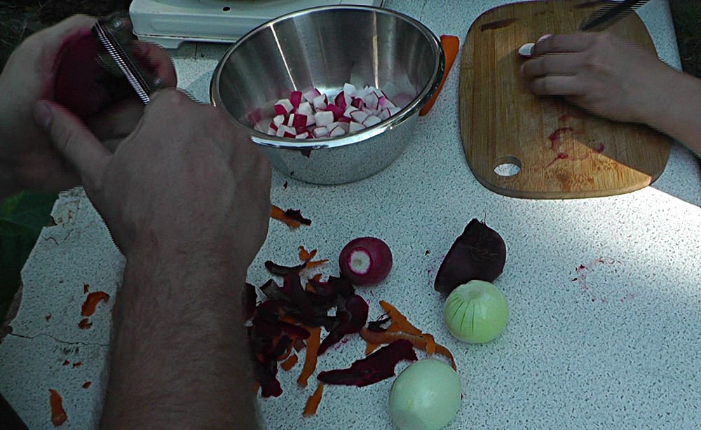 Der Saft tropft also noch und die Gläser kochen. Wir machen uns derweil ans Schälen und Schnippeln des Gemüses.